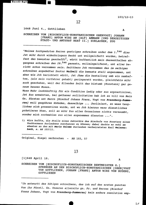 Schreiben von G. Sprenger, bischöflich-konstanzischer Rentmeister, an Johann Franz...