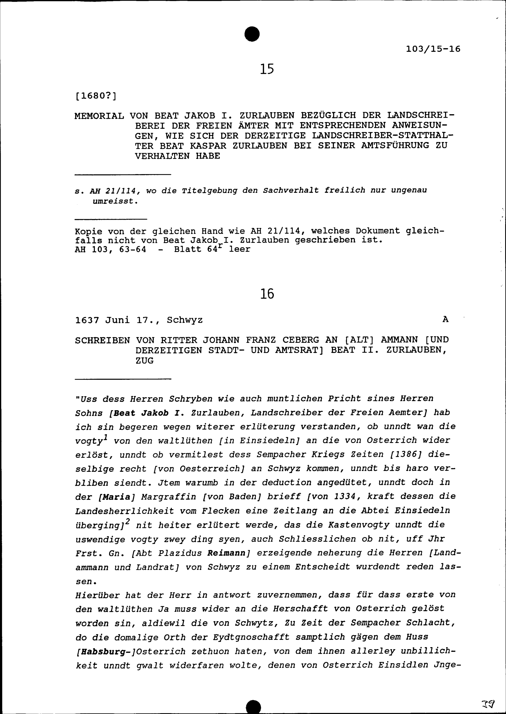 Schreiben von Johann Franz Ceberg an Beat II. Zurlauben, Altammann und Stadt- und...