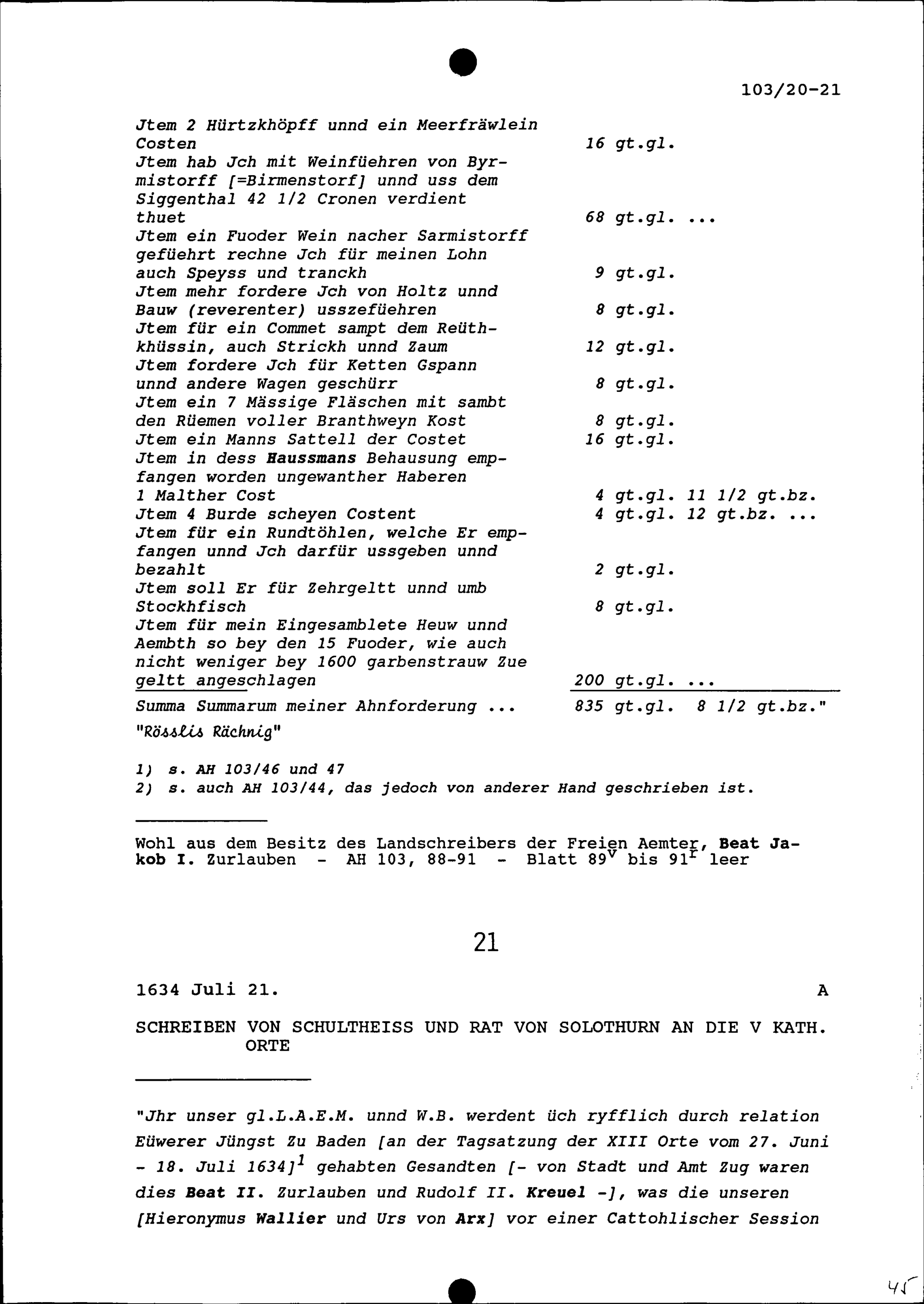 Rechnung für Melchior Honegger, Engelwirt, Bremgarten, ausgestellt von Hieronymus Karli, genannt Rössli, Bremgarter Fuhrmann,