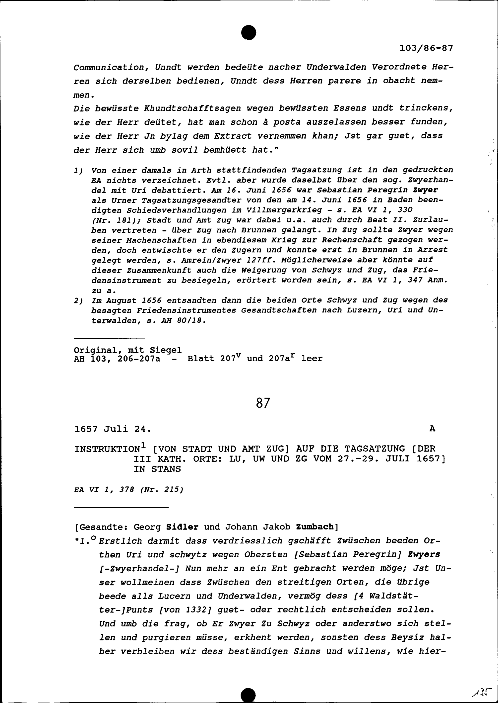 Schreiben von Paul Ceberg, Landschreiber, an Beat II. Zurlauben, Altammann und Stadt- und Amtrat, Zug