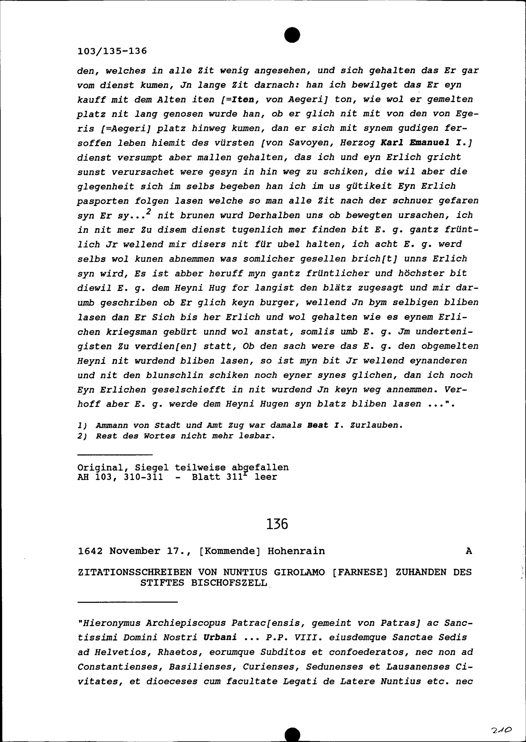 Schreiben von Hans Pfyffer, Gardehauptmann, an Ammann und Rat der Stadt Zug