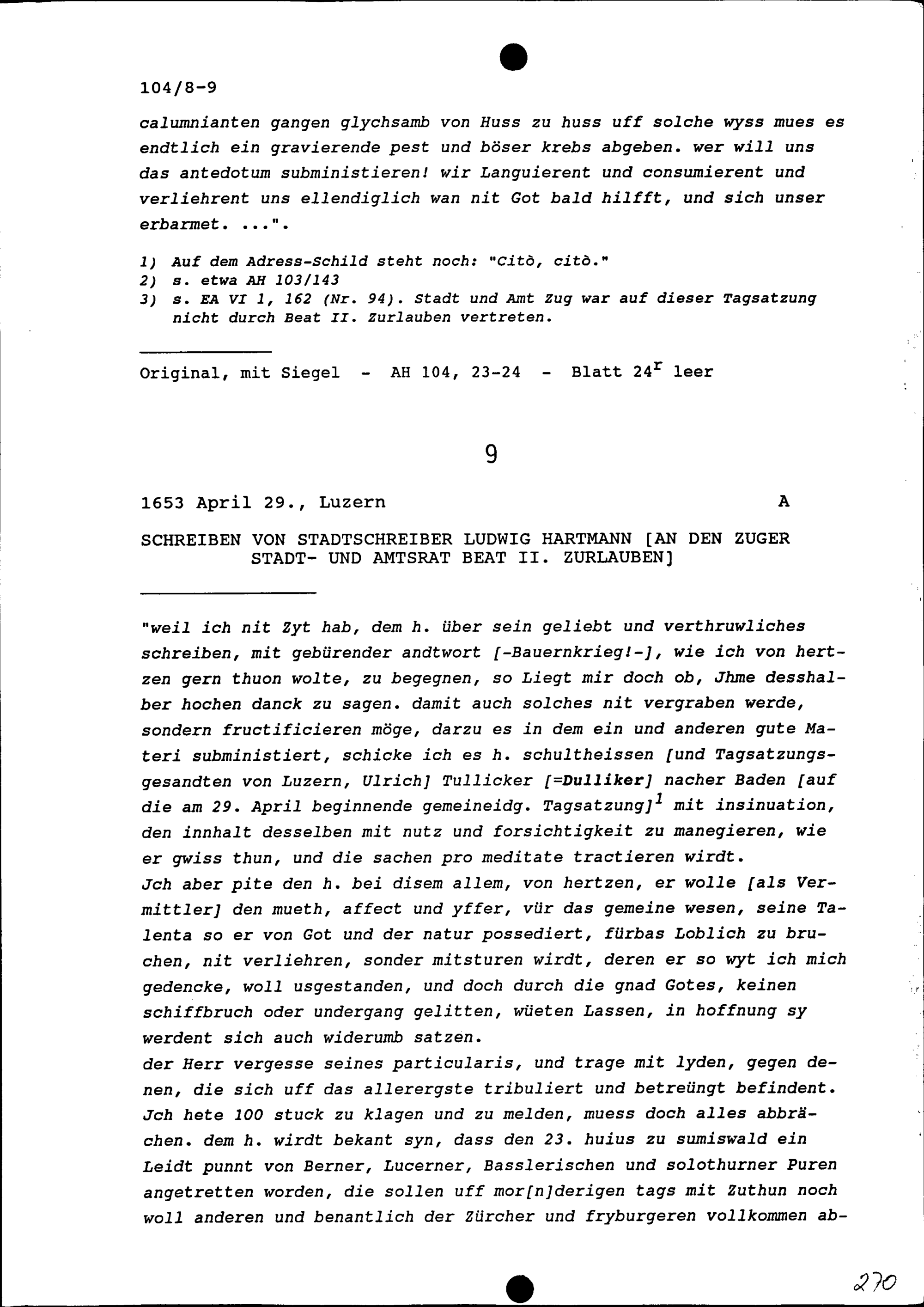 Schreiben von Ludwig Hartmann, Stadtschreiber, an Beat II. Zurlauben, Altammann und Stadt- und Amtrat, Zug