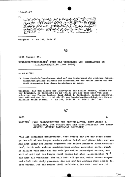 Notiz von Beat Jakob I. Zurlauben, Landschreiber der Freien Ämter, zum Streit mit Johann Balthasar Honegger, Schultheiss von Bremgarten