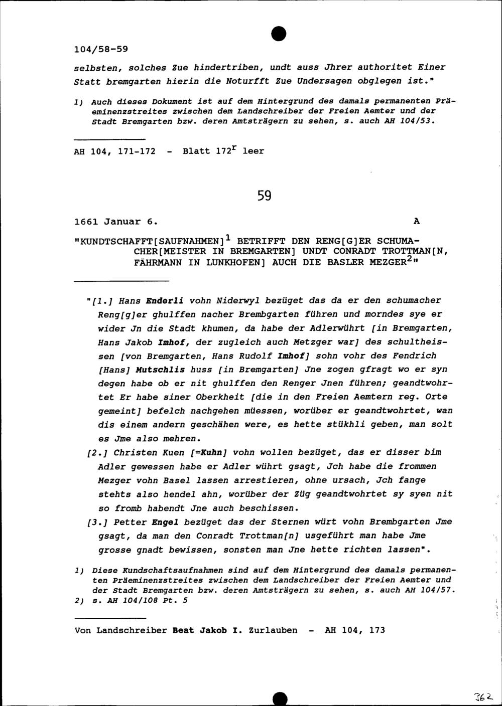 Gutachten zum Begehren der Stadt Bremgarten an Beat Jakob I. Zurlauben, Landschreiber der Freien Ämter, bezüglich dessen dortigem Bürgerrecht