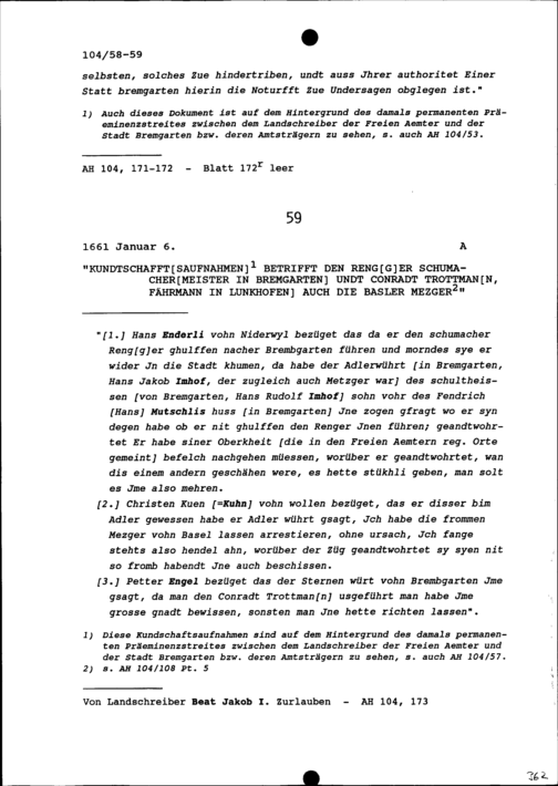 Gutachten zum Begehren der Stadt Bremgarten an Beat Jakob I. Zurlauben, Landschreiber...