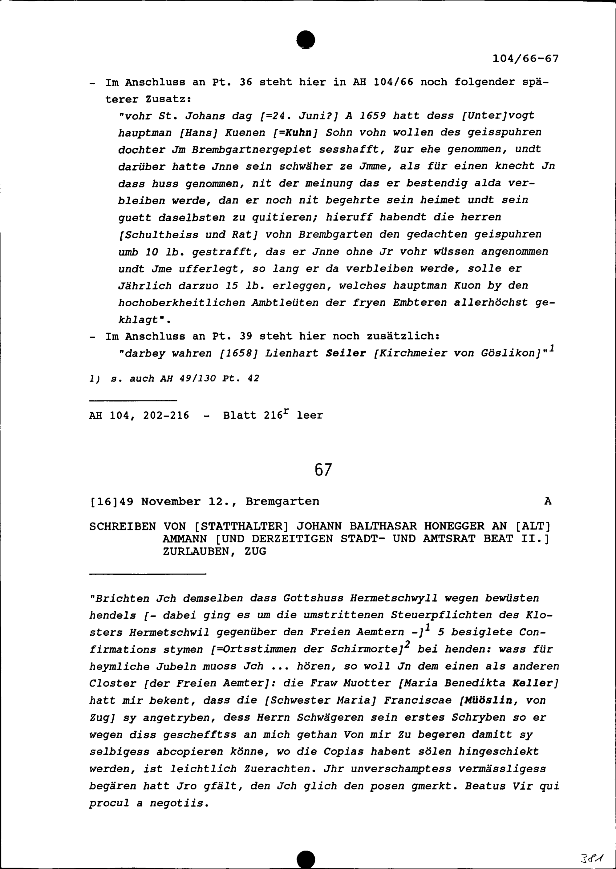 Aufzeichnungen zu den Vorfällen in Bremgarten (Präeminenzstreitigkeit) zwischen dem Landschreiber der Freien Ämter und der Stadt Bremgarten beziehungsweise deren Amtsträgern, aufgezeichnet von Beat Jakob I. Zurlauben, Landschreiber