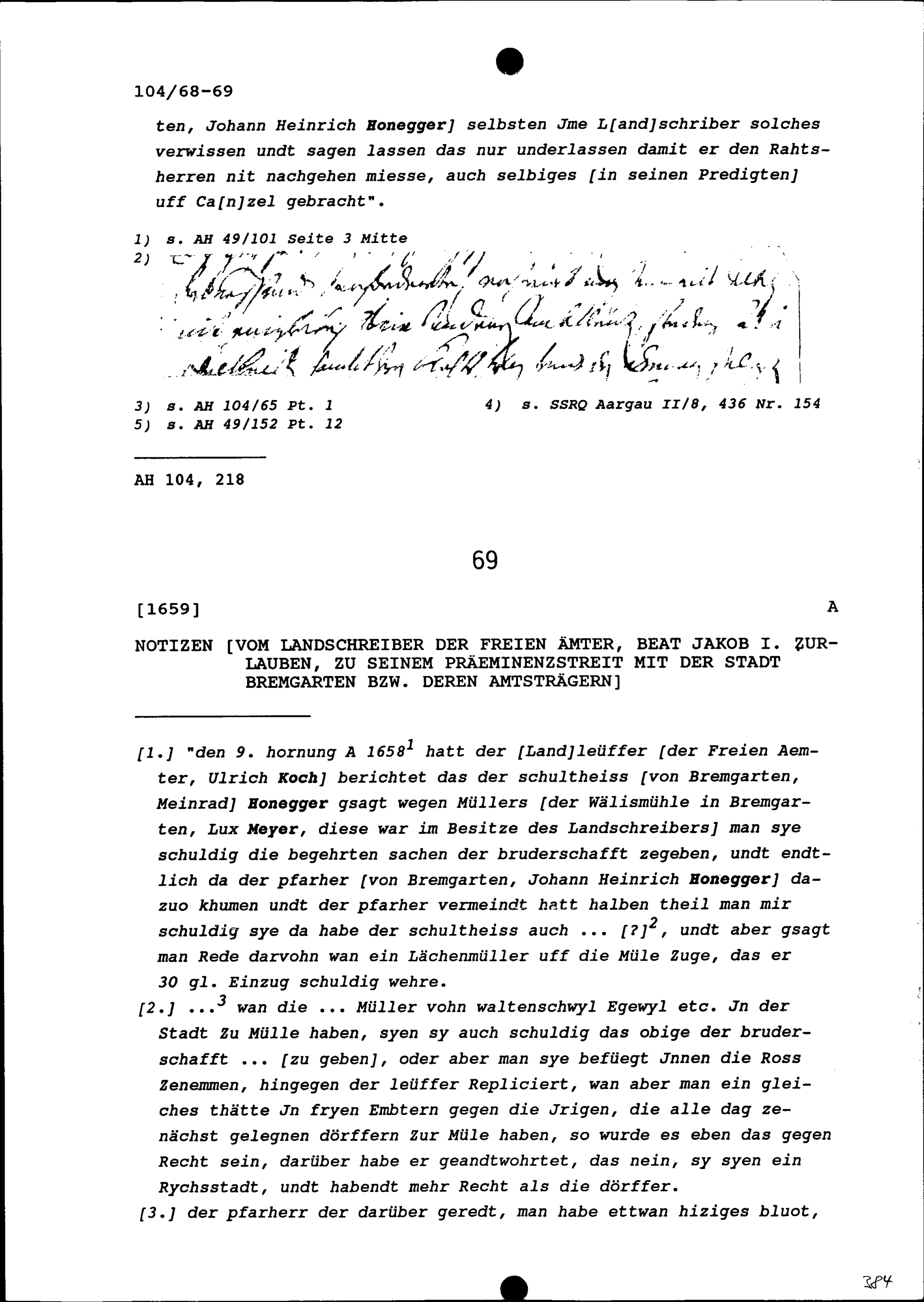 Notiz von Beat Jakob I. Zurlauben, Landschreiber der Freien Ämter, zum Präeminenzstreit mit der Stadt Bremgarten