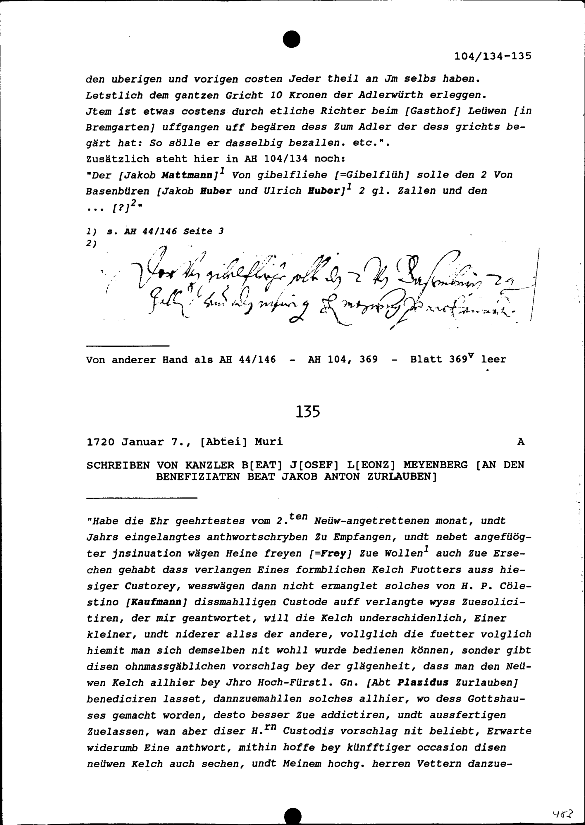 Urteil im Streit zwischen Hans Rudolf Imhof, Adlerwirt, und Jakob Meienberg, Wirt...