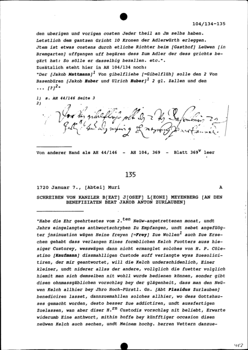 Urteil im Streit zwischen Hans Rudolf Imhof, Adlerwirt, und Jakob Meienberg, Wirt auf der Rathausstube, beide von Bremgarten