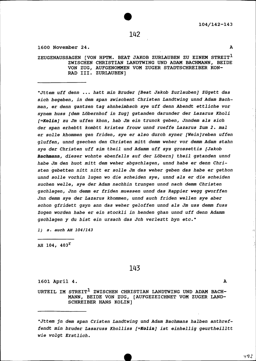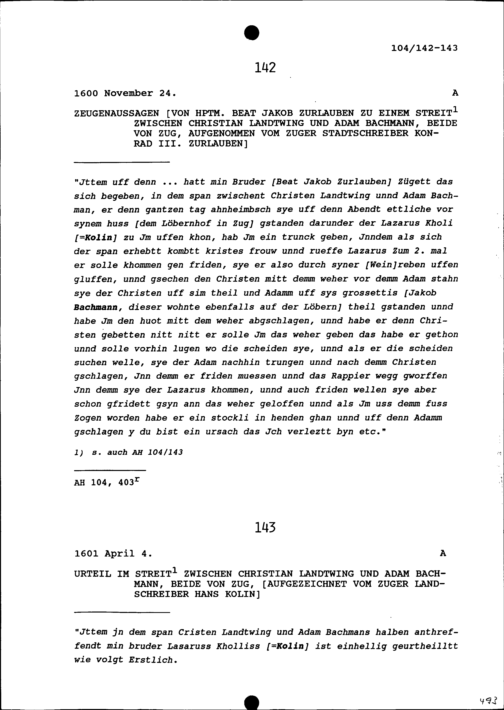 Urteil im Streit zwischen Christian Landtwing und Adam Bachmann, beide von Zug, aufgezeichnet von Hans Kolin, Zuger Landschreiber