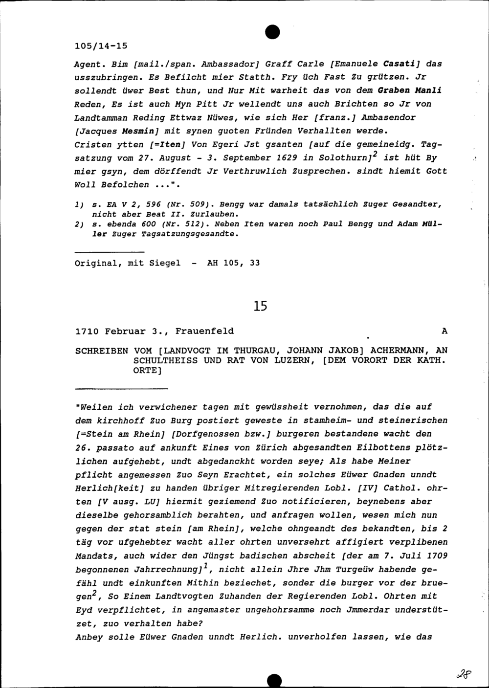 Schreiben von Paul Stocker, Stadt- und Amtrat Zug, an Beat II. Zurlauben, Landschreiber der Freien Ämter und Stadt- und Amtrat Zug, Bremgarten