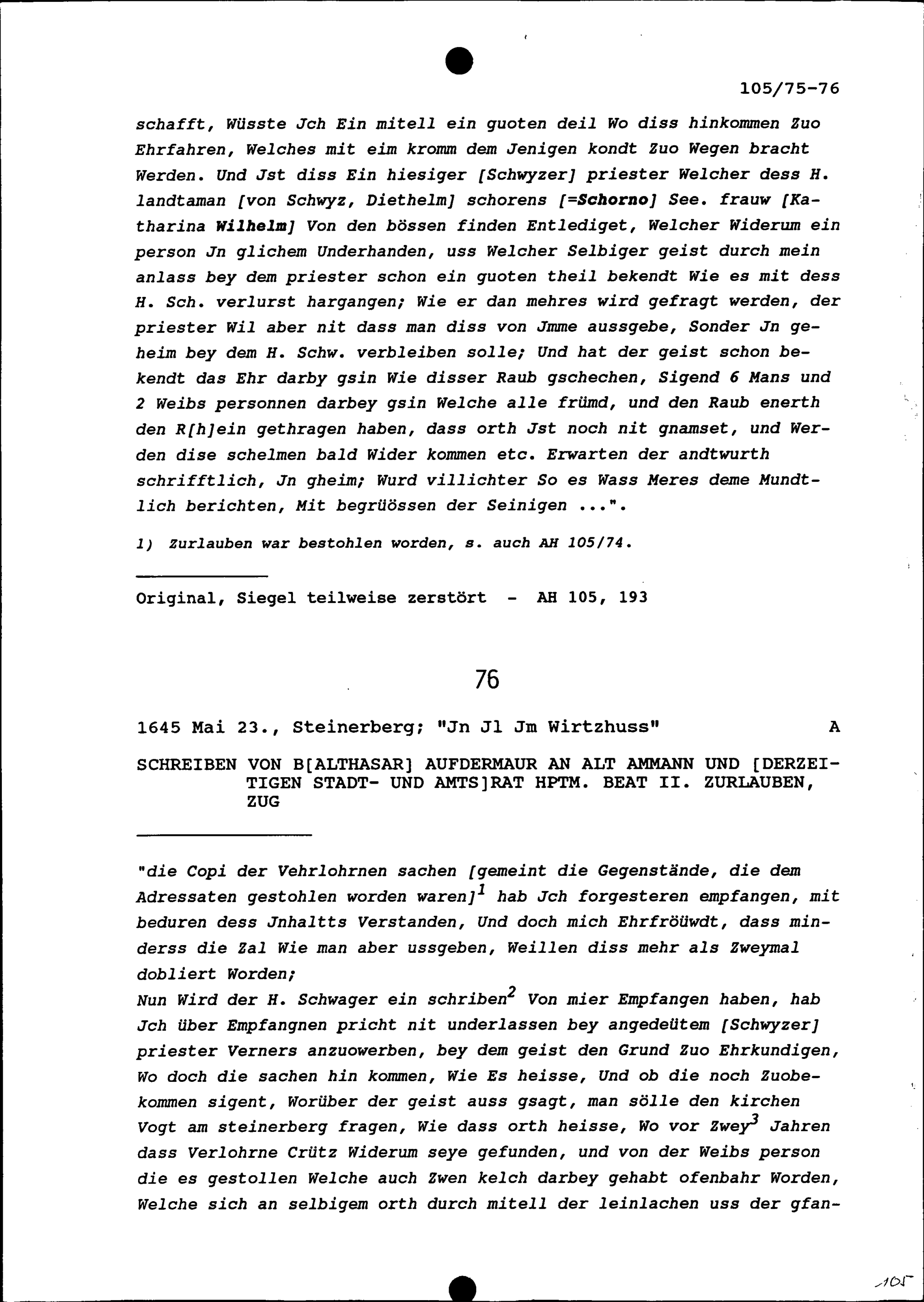 Schreiben von Balthasar Aufdermaur an Beat II. Zurlauben, Altammann und Stadt- und...