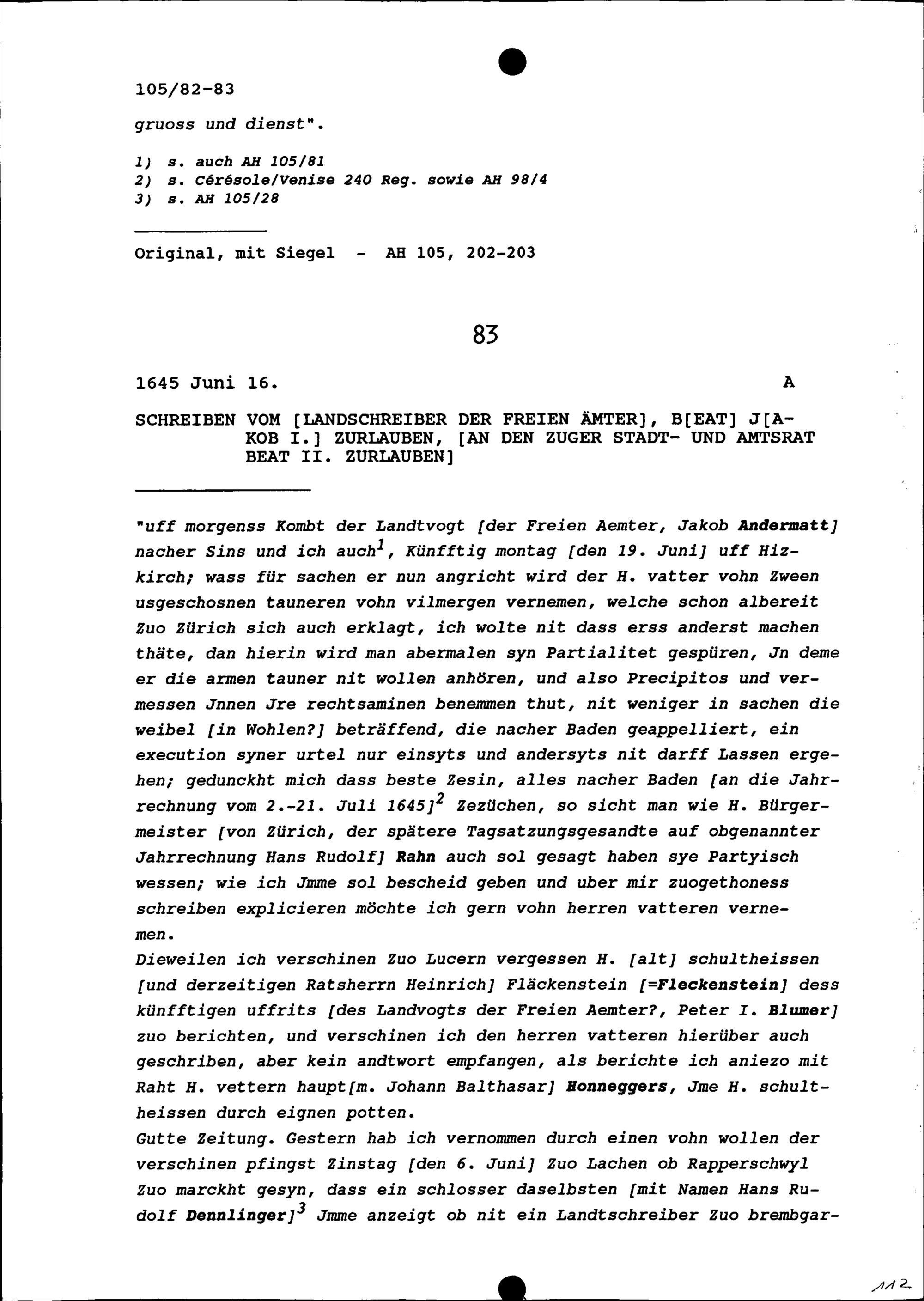 Schreiben von Johann Kaspar Ceberg, Ratsherr Schwyz, an Beat II. Zurlauben, Ammann, Zug