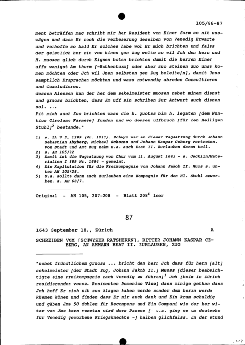 Schreiben von Johann Kaspar Ceberg, Ratsherr, an Beat II. Zurlauben, Ammann und Hauptmann,...