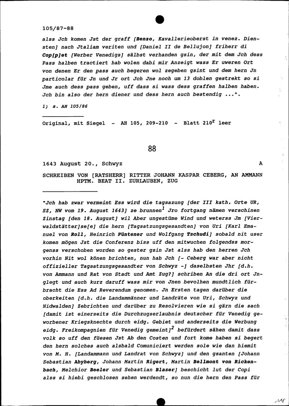 Schreiben von Johann Kaspar Ceberg, Ratsherr Schwyz, an Beat II. Zurlauben, Ammann, Zug