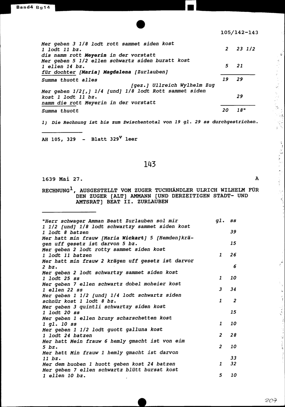 Rechnung für Beat II. Zurlauben, Zuger Altammann und Stadt- und Amtrat, ausgestellt von Ulrich Wilhelm, Zuger Tuchhändler