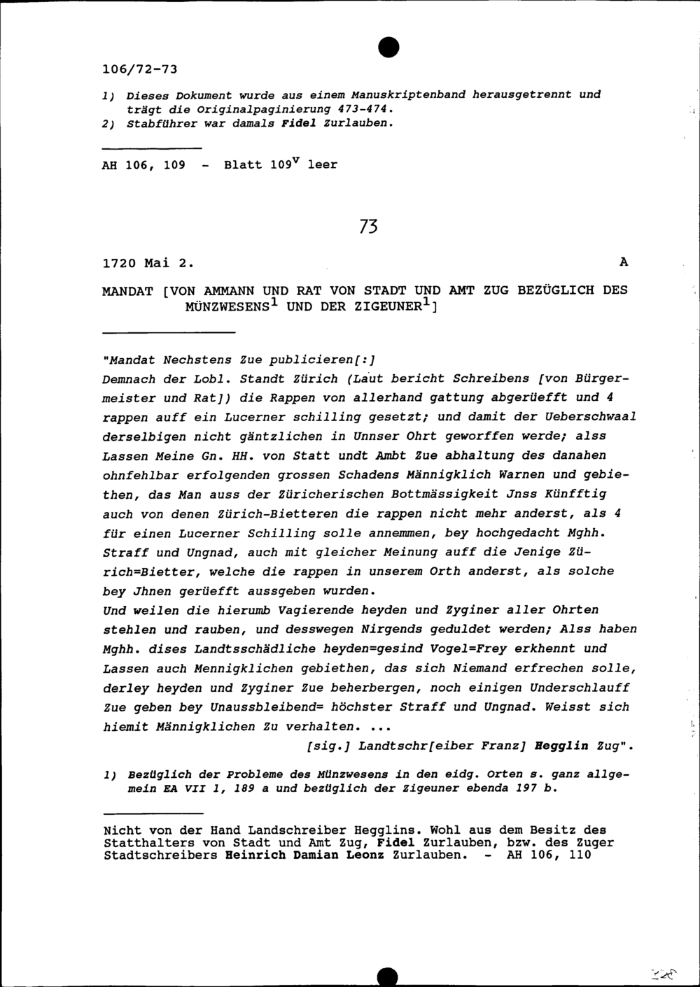 Ratsbeschluss des Ammanns (Stabführers) und Rats der Stadt Zug für Balthasar Hürlimann,...