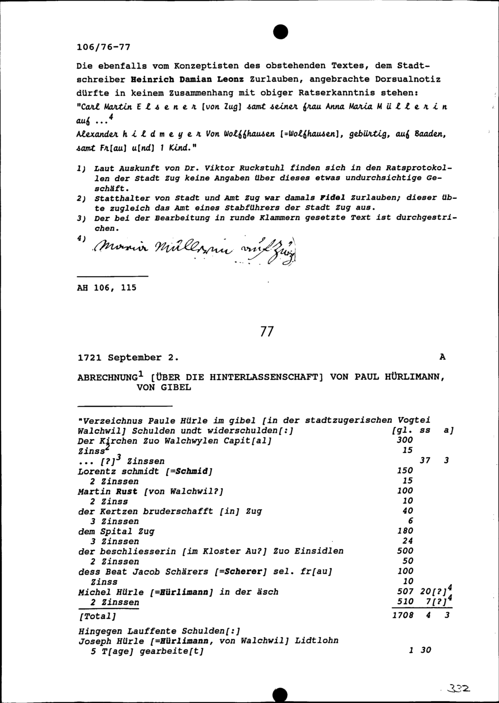 Ratsbeschluss des Statthalters und Rats der Stadt Zug zugunsten von Michael Stadlin, von Zug, und Karl Hürlimann, von Walchwil