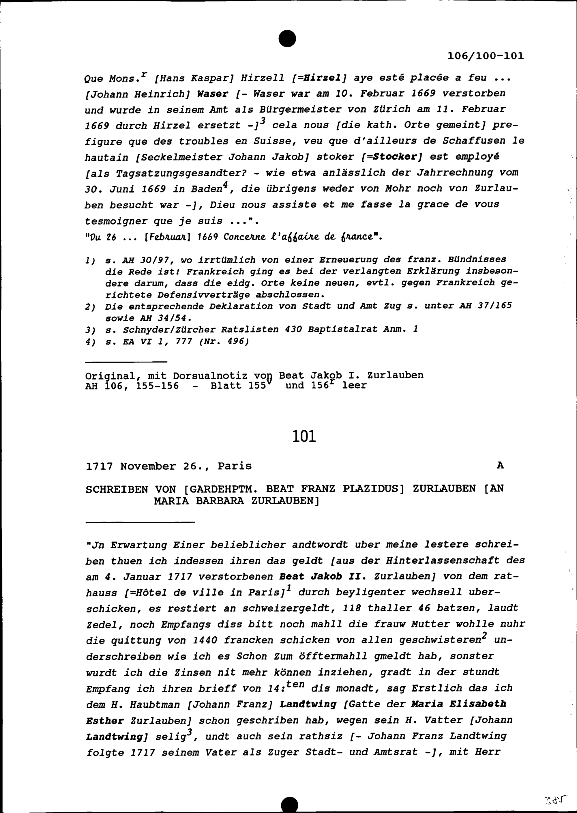 Schreiben von Rudolf Mohr, Ratsherr, an Beat Jakob I. Zurlauben, Statthalter Zug