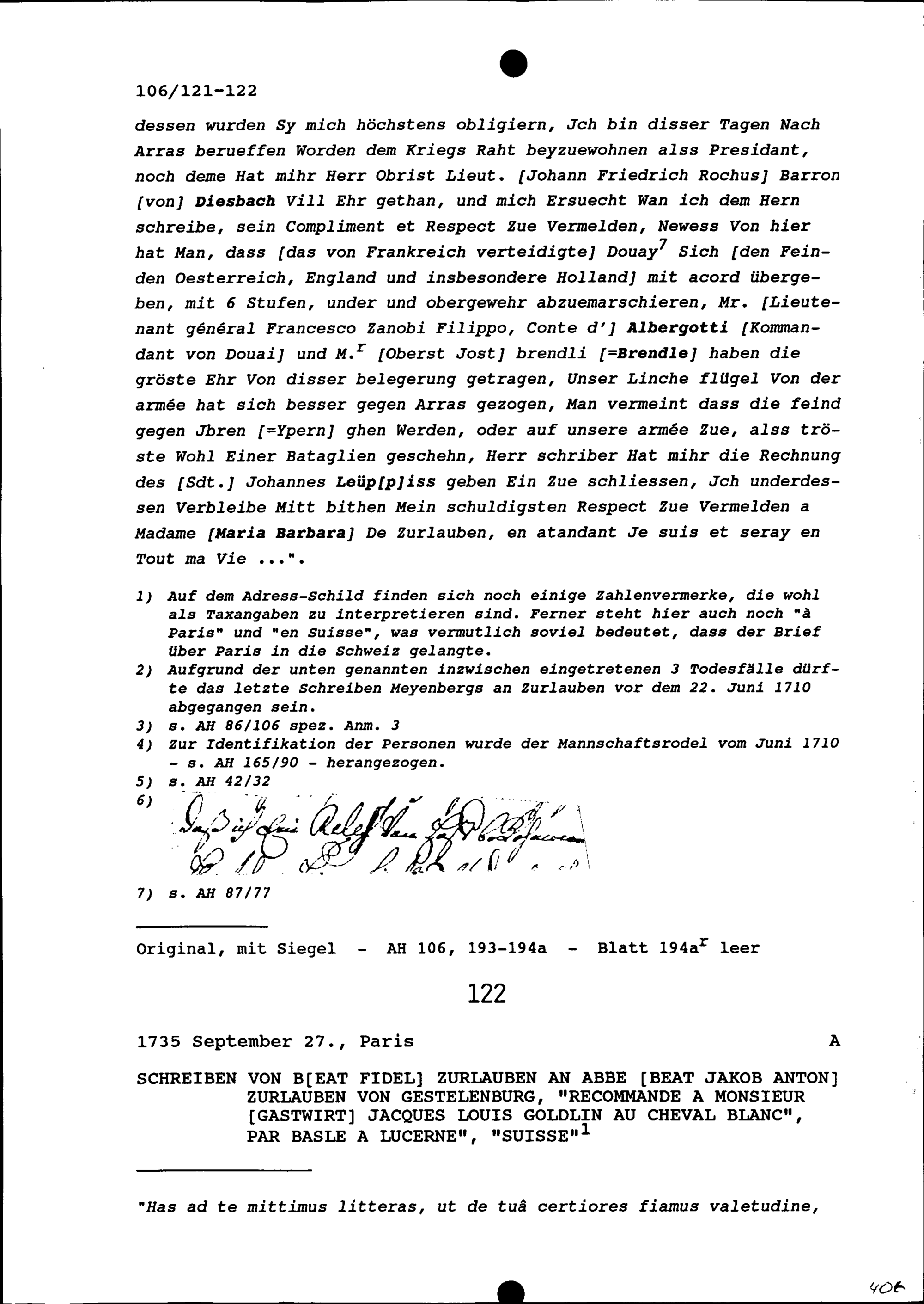 Schreiben von Franz Leonz Meyenberg, Kommandant in der Kompanie Zurlauben im Regiment Pfyffer, an Beat Jakob II. Zurlauben, Kompanieinhaber, Altlandammann und Stadt- und Amtrat, Zug