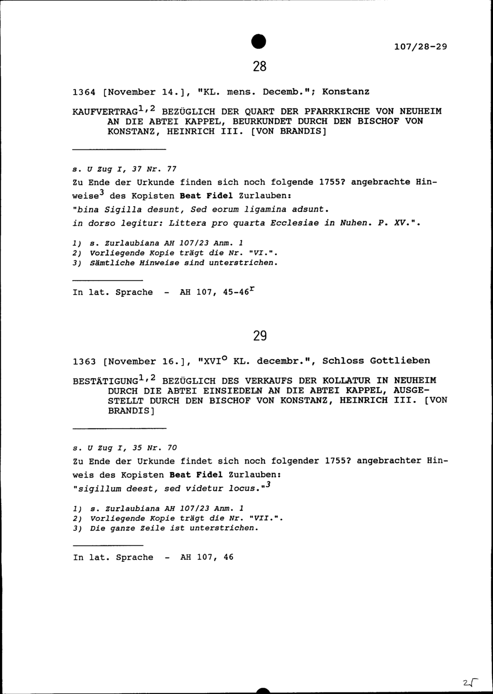 Bestätigung bezüglich des Verkaufs der Kollatur in Neuheim durch die Abtei Einsiedeln an die Abtei Kappel, ausgestellt durch Heinrich III. von Brandis, Bischof von Konstanz