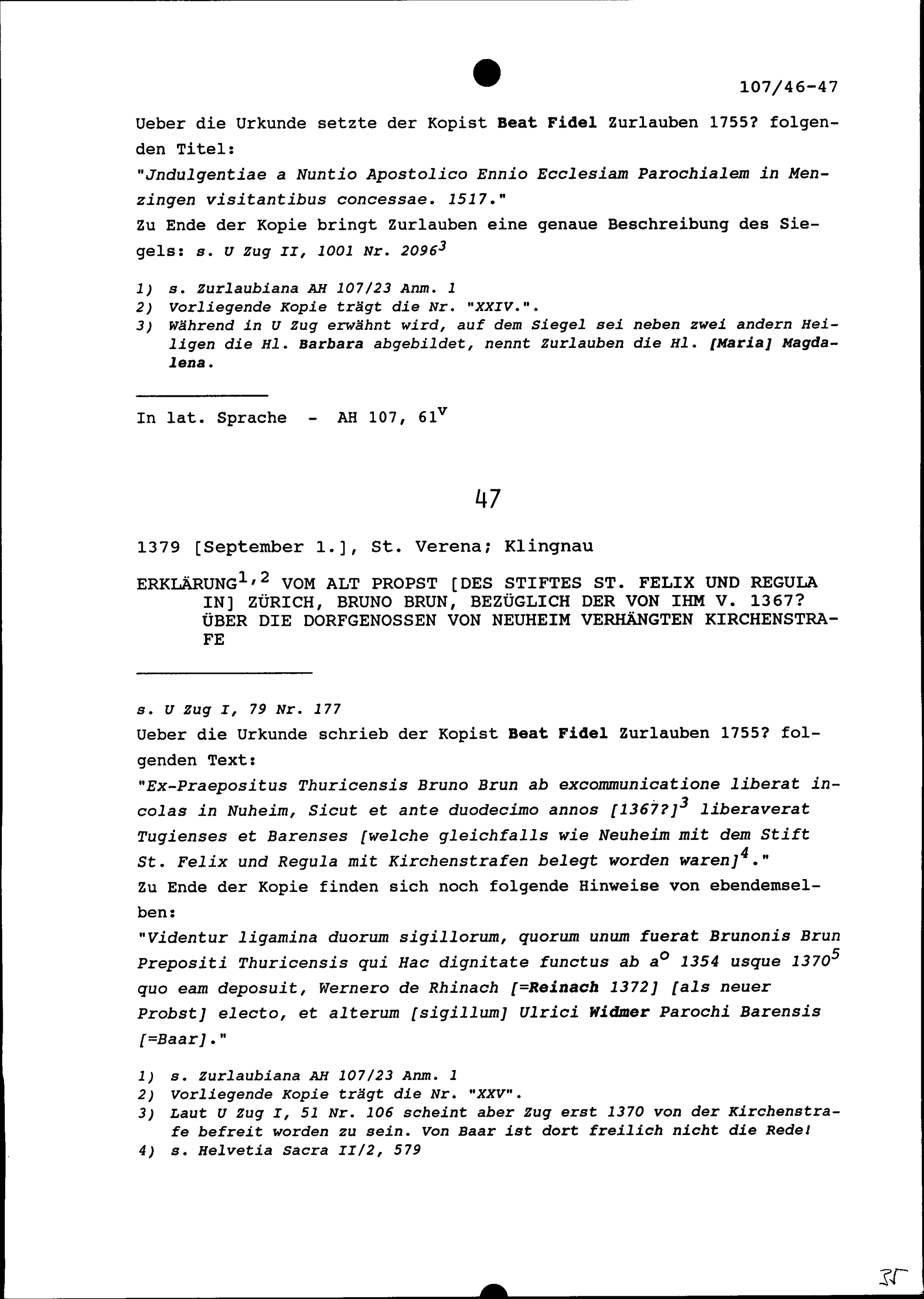 Ablassverleihung durch Ennio Filonardi, Nuntius bei den Eidgenössischen Orten, zugunsten von Kirche und Beinhaus in Menzingen