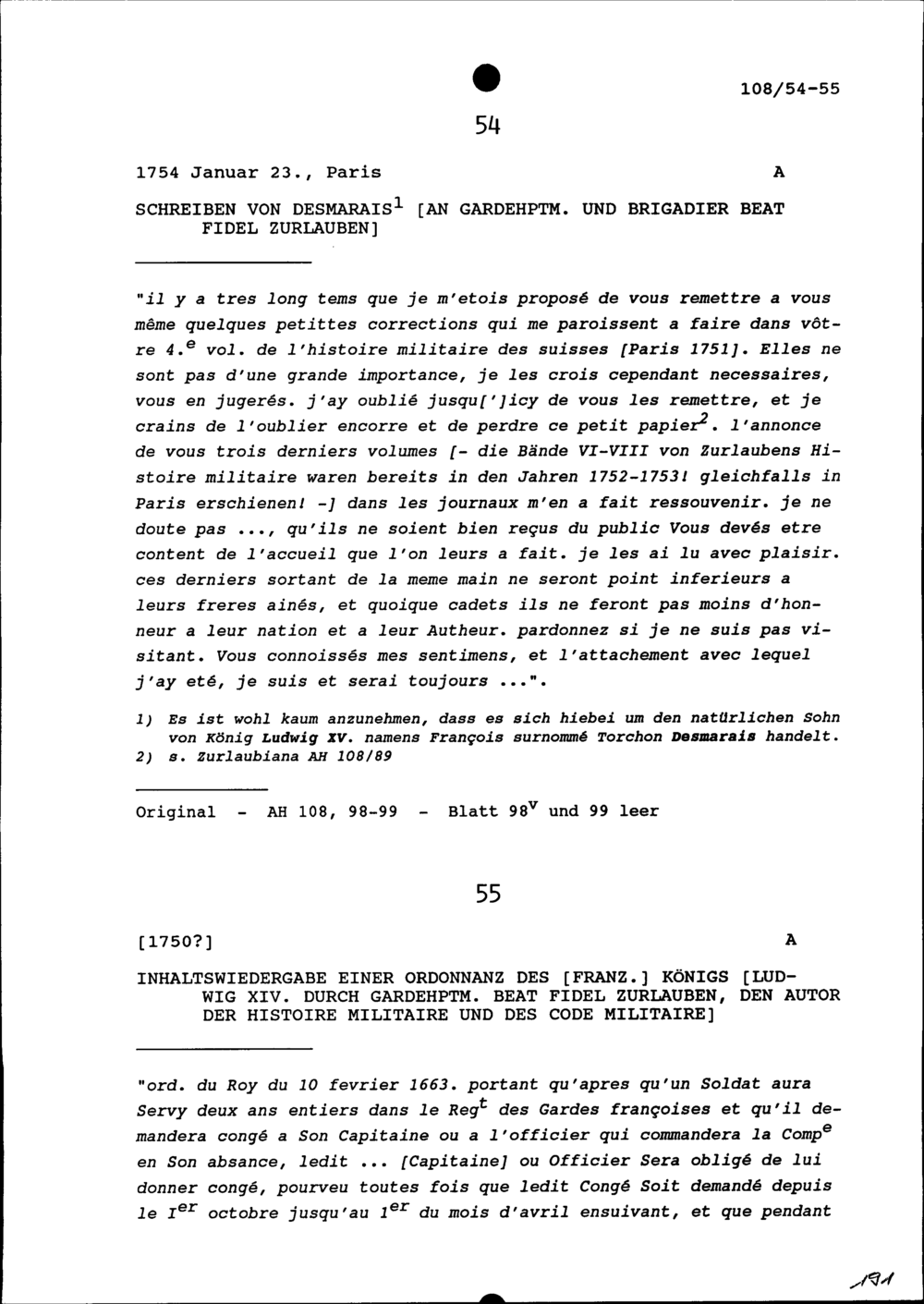 Inhaltswiedergabe einer Ordonnanz von Ludwig XIV., König von Frankreich, aufgezeichnet von Beat Fidel Zurlauben, Gardehauptmann und Brigadier