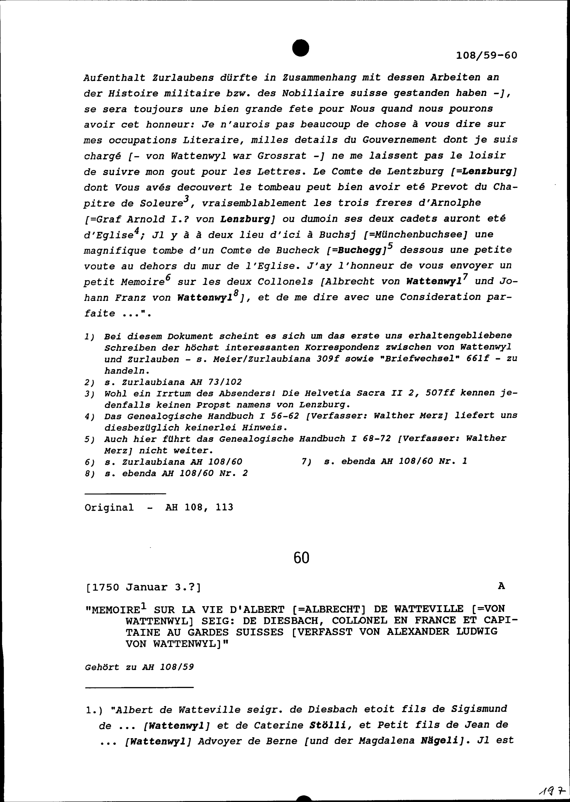 Schreiben von Alexander Ludwig von Wattenwyl an Beat Fidel Zurlauben, Gardehauptmann...