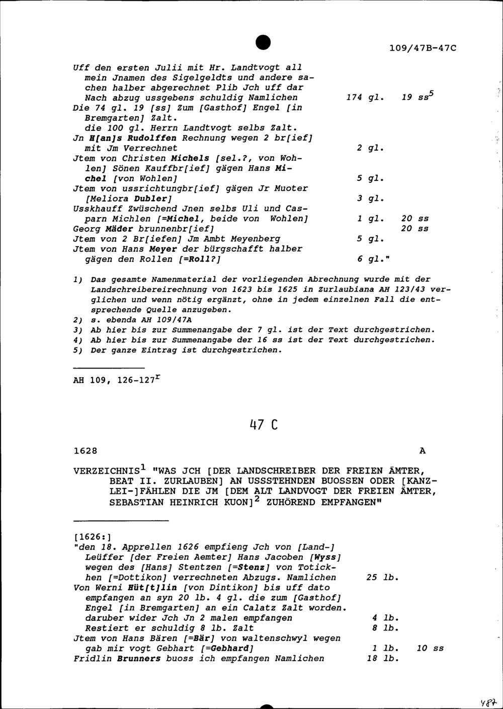 Rechnung für Siegelgeld der Kanzleigefälle unter Sebastian Heinrich Kuon (Kuhn), Landvogt der Freien Ämter und Landrat zu Uri, aufgezeichnet von Beat II. Zurlauben, Landschreiber