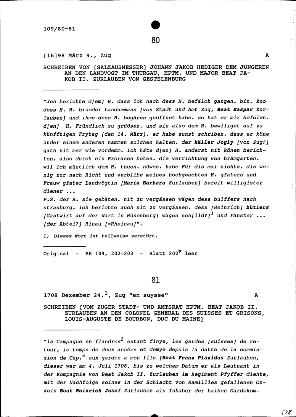 Schreiben von Beat Jakob II. Zurlauben, Stadt- und Amtrat Zug Hauptmann, an Louis-Auguste...