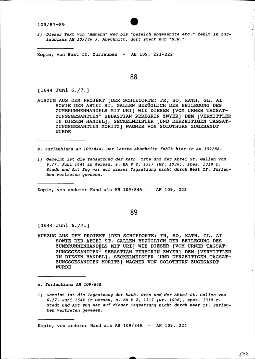 Vereinter Vorschlag der Schiedsorte Freiburg, Solothurn, Katholisch Glarus und Appenzell-Innerrhoden sowie der Abtei Sankt Gallen unter andern im Zumbrunnenhandel mit Uri
