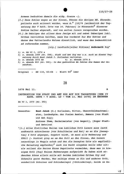 Instruktion von Stadt und Amt Zug auf die Tagsatzung der Vier Katholischen Orte vom 14. April 1678 in Brunnen