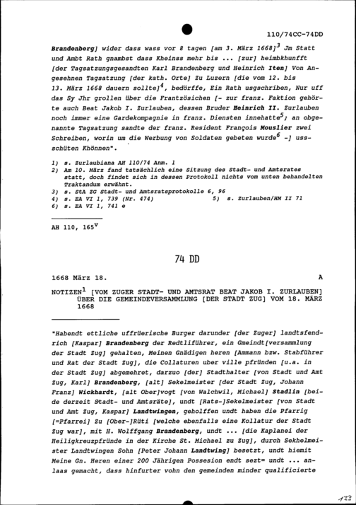 Notiz von Beat Jakob I. Zurlauben, Stadt- und Amtrat Zug, über die Einberufung einer...