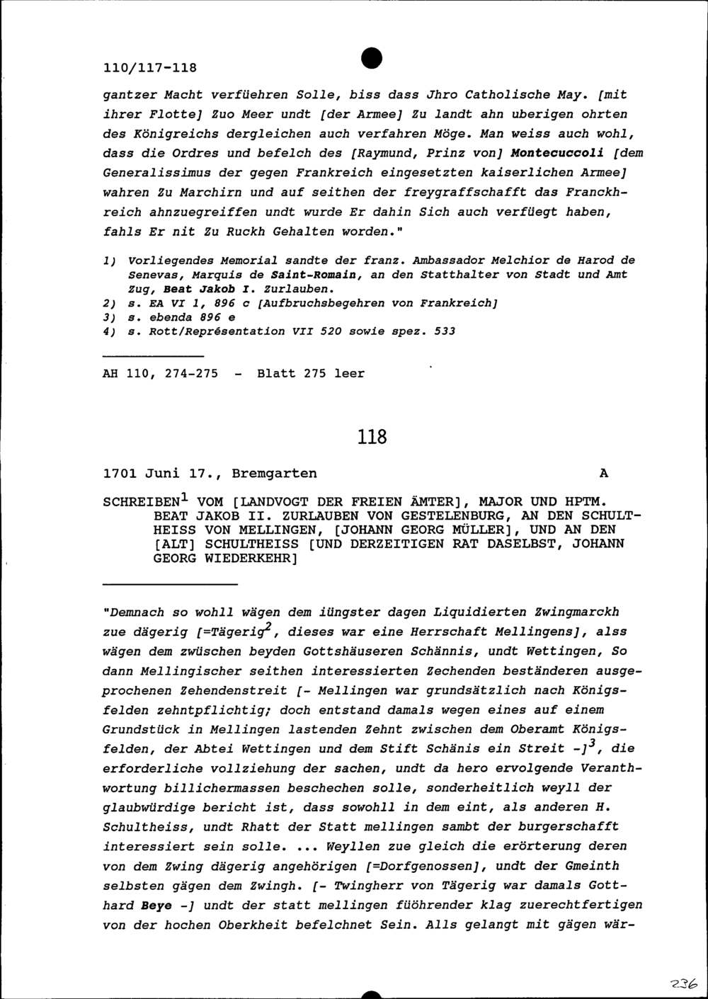 Bericht bezüglich der von Leopold I., Kaiser des Heiligen Römischen Reiches, und von Marquard Schenk von Castel, Bischof von Eichstätt und kaiserlicher Prinzipalkommissar beim Reichstag in Regensburg, an die Eidgenössischen Orte Gesandten Schreiben