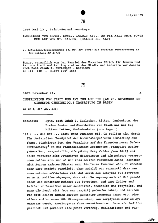 Instruktion von Stadt und Amt Zug auf die am 26. November beginnende Tagsatzung in Baden