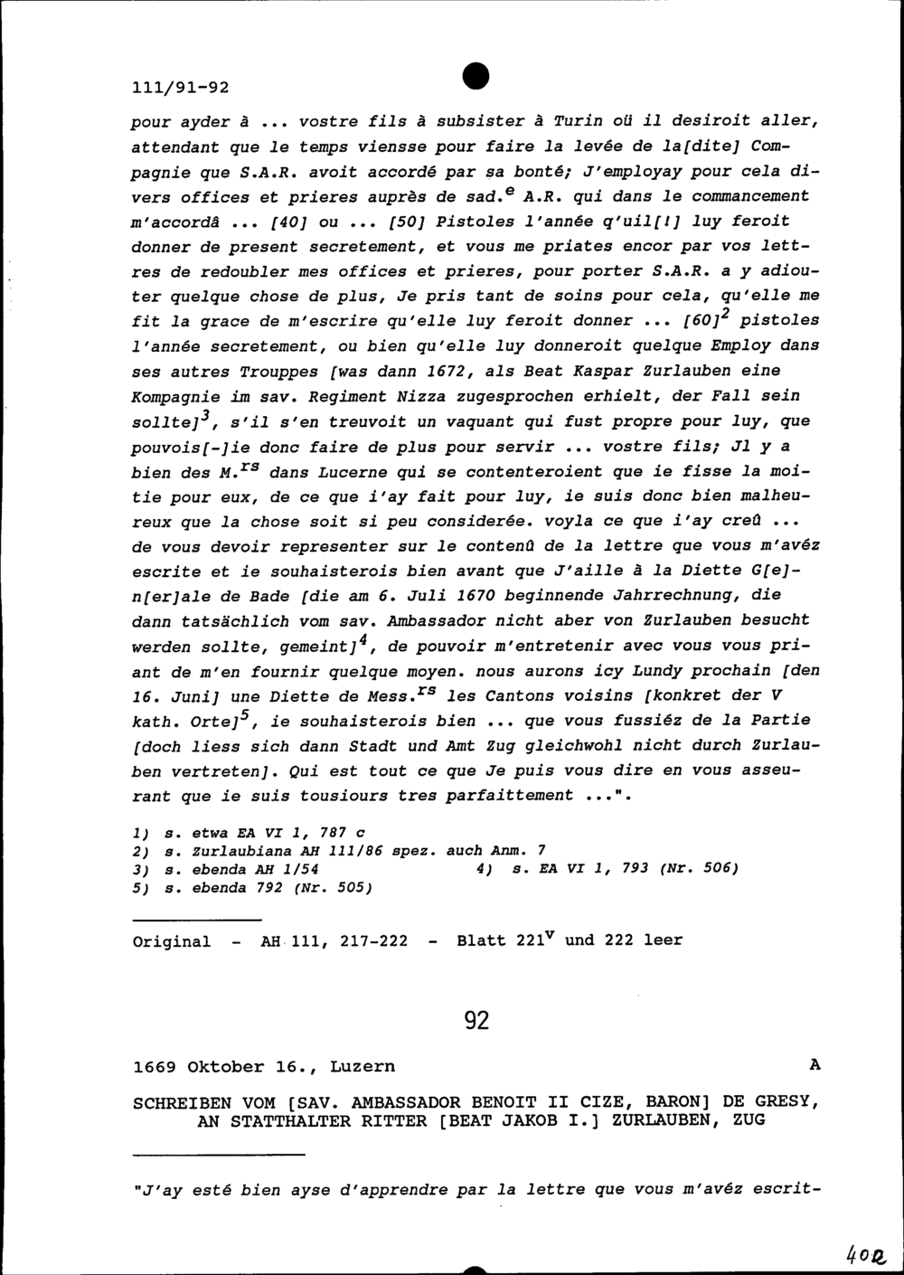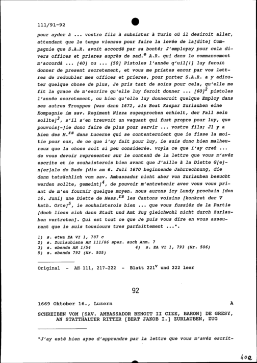 Schreiben von Benoît II. Cize, Marquis de Grésy, Ambassador von Savoyen, an Beat Jakob I. Zurlauben, Statthalter von Stadt und Amt Zug