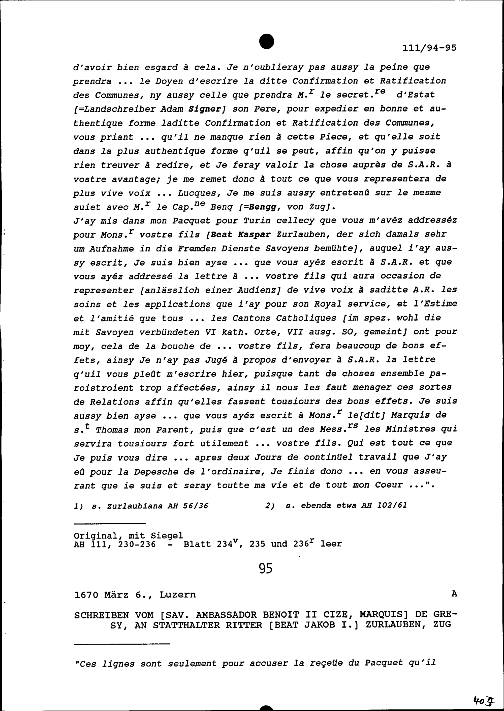 Schreiben von Benoît II. Cize, Marquis de Grésy, Ambassador von Savoyen, an Beat Jakob I. Zurlauben, Statthalter, Zug