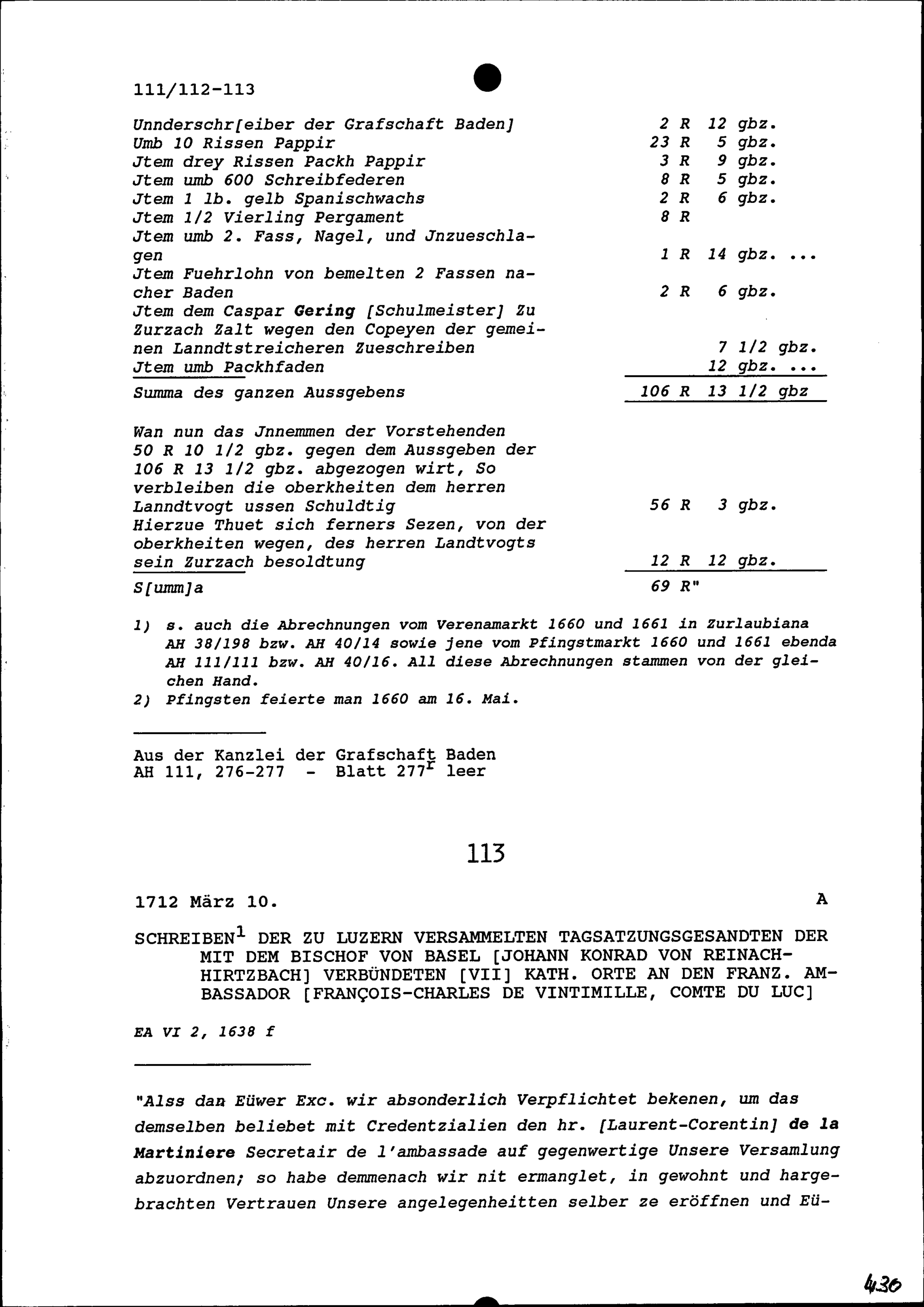 Abrechnung über die Einnahmen und Ausgaben von Heinrich II. Zurlauben, Landvogt der Grafschaft Baden, wegen der in der Grafschaft Baden regierenden Acht Alten Orte am Zurzacher Pfingstmarkt