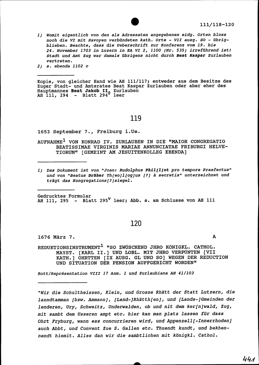Reduktionsinstrument zwischen Karl II., König, und den Sieben Katholischen Orten...