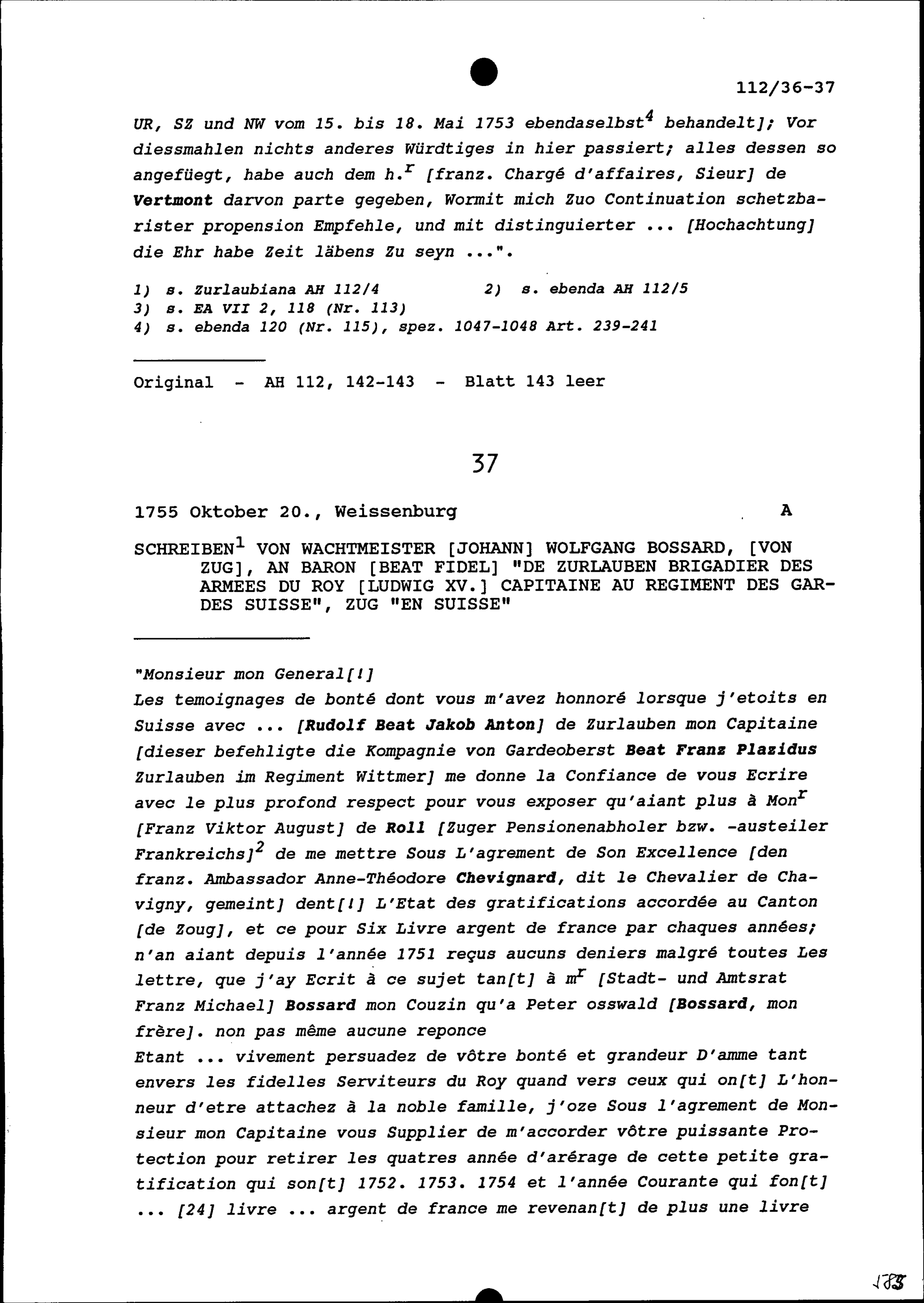 Schreiben von Franz Alois Achermann, Landammann von Nidwalden, an Beat Fidel Zurlauben, Gardehauptmann und Brigadier