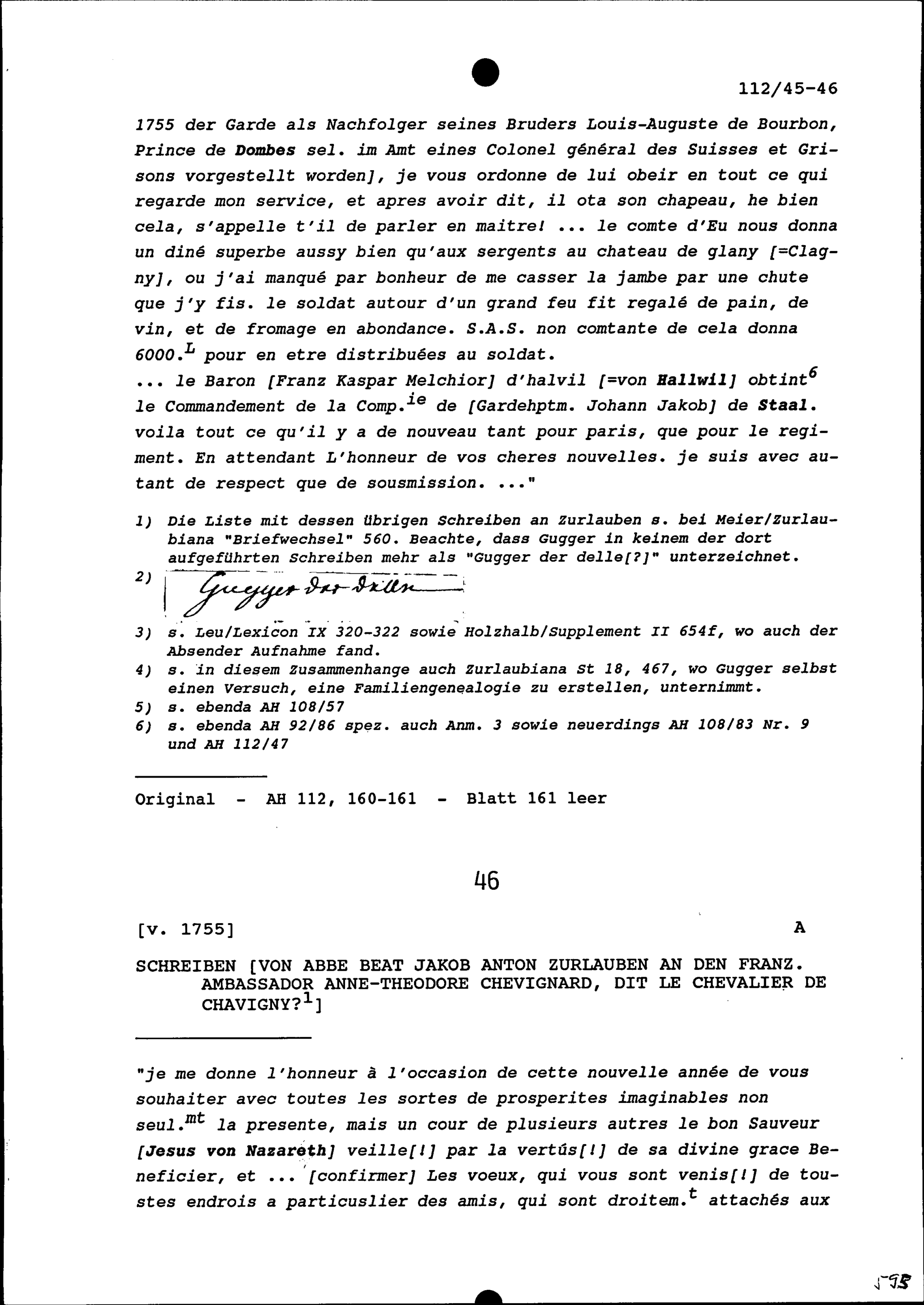 Schreiben von Peter Josef Gugger, Gardeleutnant, genannt der Delle, an Beat Fidel Zurlauben, Gardehauptmann und Brigadier