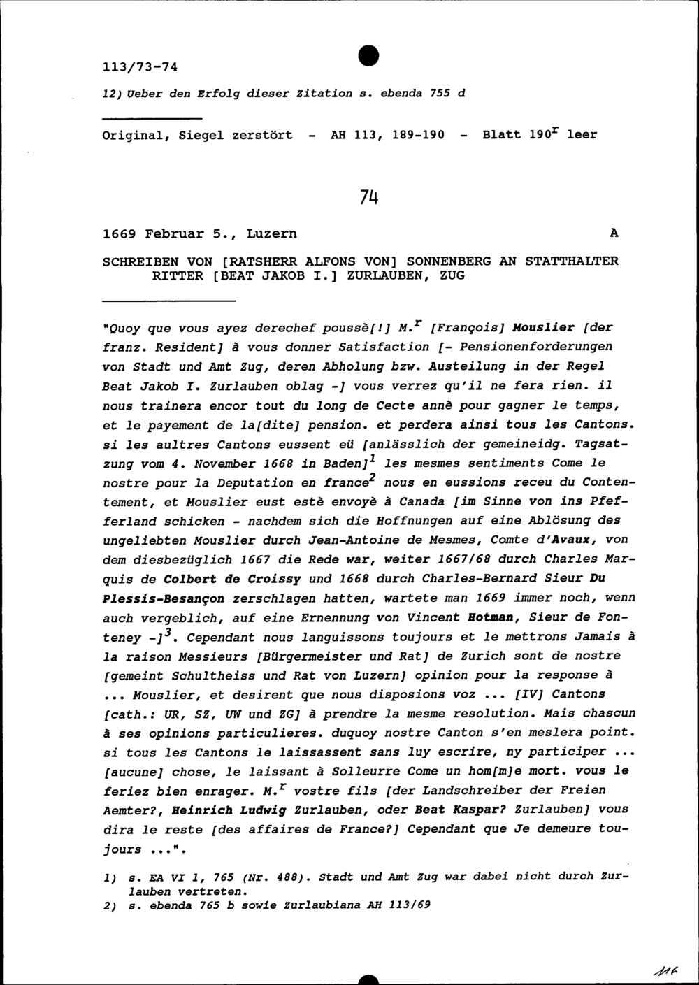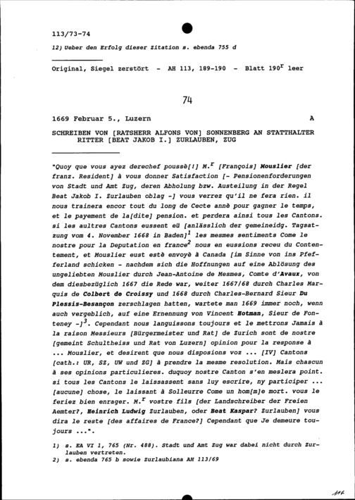 Schreiben von Alfons von Sonnenberg, Schultheiss, an Beat Jakob I. Zurlauben, Major und Statthalter, Zug
