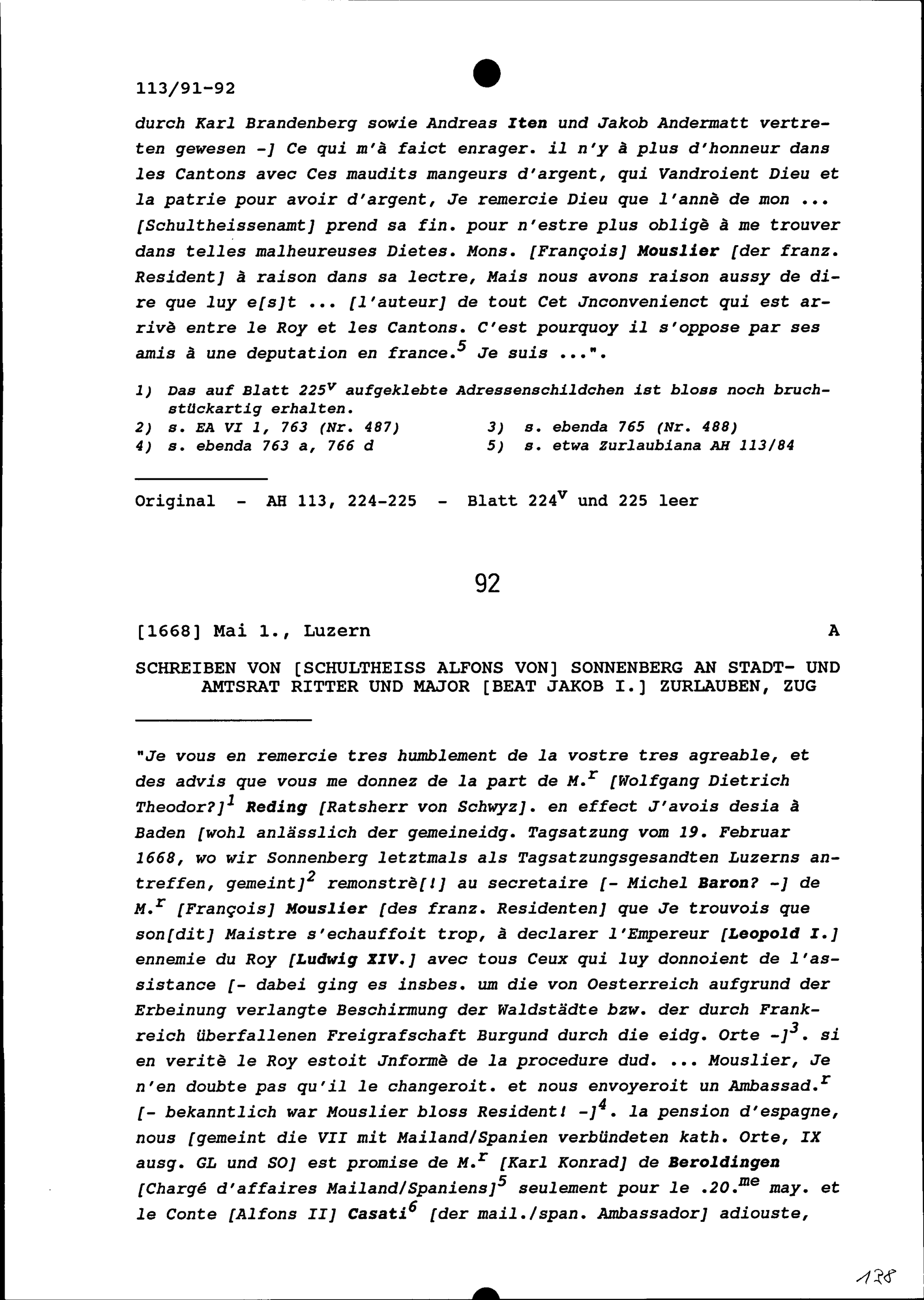 Schreiben von Alfons von Sonnenberg, Schultheiss, an Beat Jakob I. Zurlauben, Statthalter von Stadt und Amt Zug