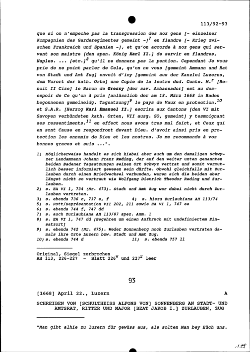 Schreiben von Alfons von Sonnenberg, Schultheiss, an Beat Jakob I. Zurlauben, Stadt- und Amtrat und Major, Zug
