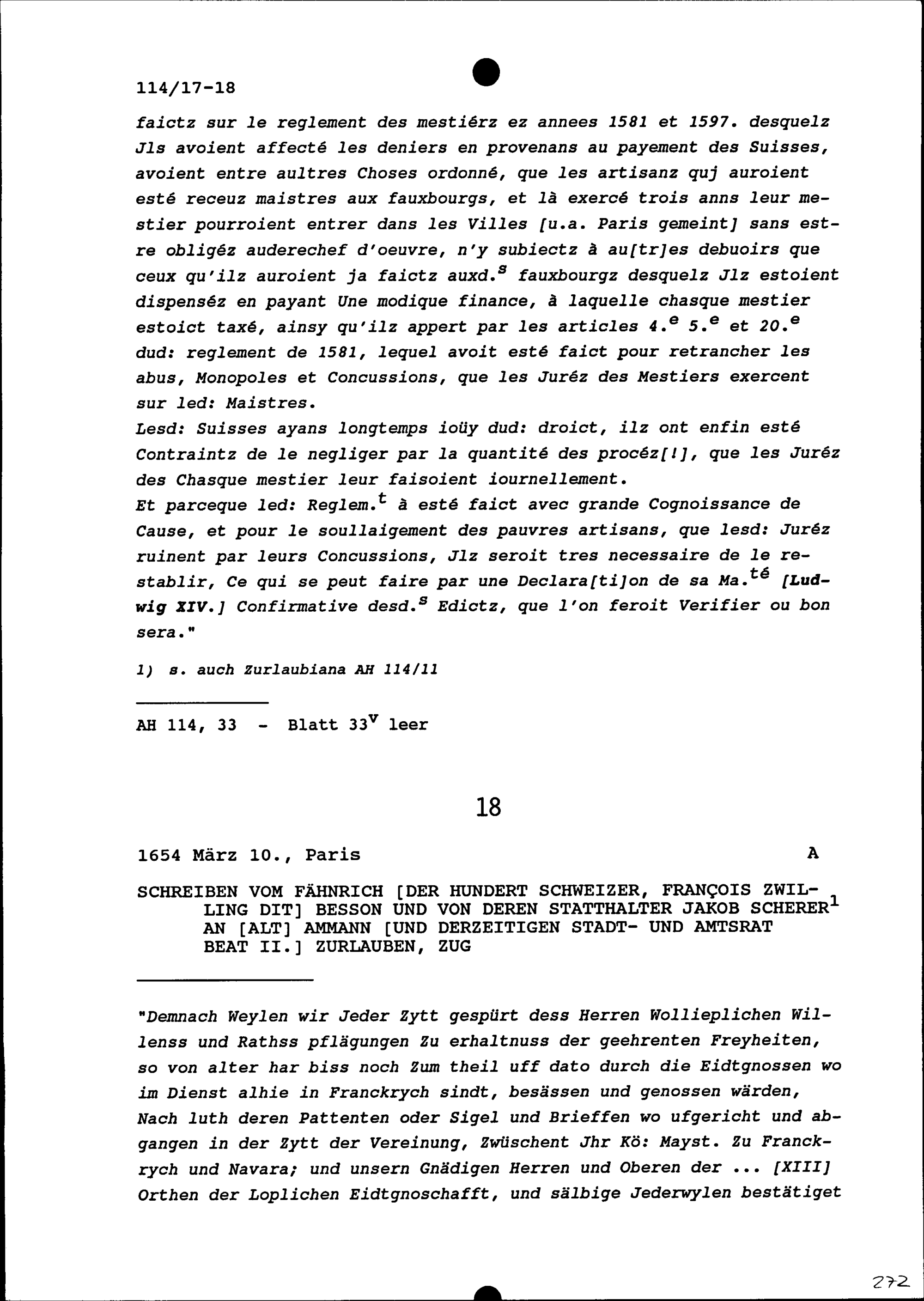 Vorschläge betreffend verbesserter Möglichkeiten, die eidgenössischen in französischen Diensten stehenden Truppen zu bezahlen, aufgezeichnet von Heinrich II. Zurlauben, Gardehauptmann