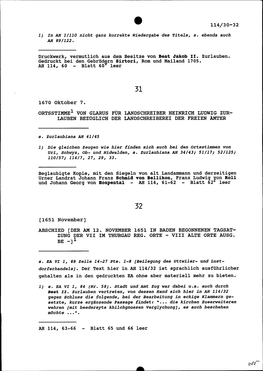 Abschied der am 12. November 1651 in Baden begonnenen Tagsatzung der Sieben im Thurgau regierenden Orte
