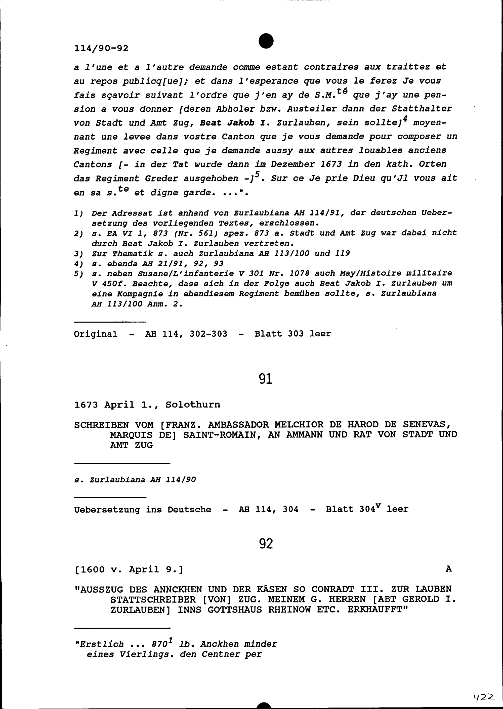 Schreiben von Melchior de Harod de Senevas, Marquis de Saint-Romain, Ambassador von Frankreich, an Ammann und Rat von Stadt und Amt Zug