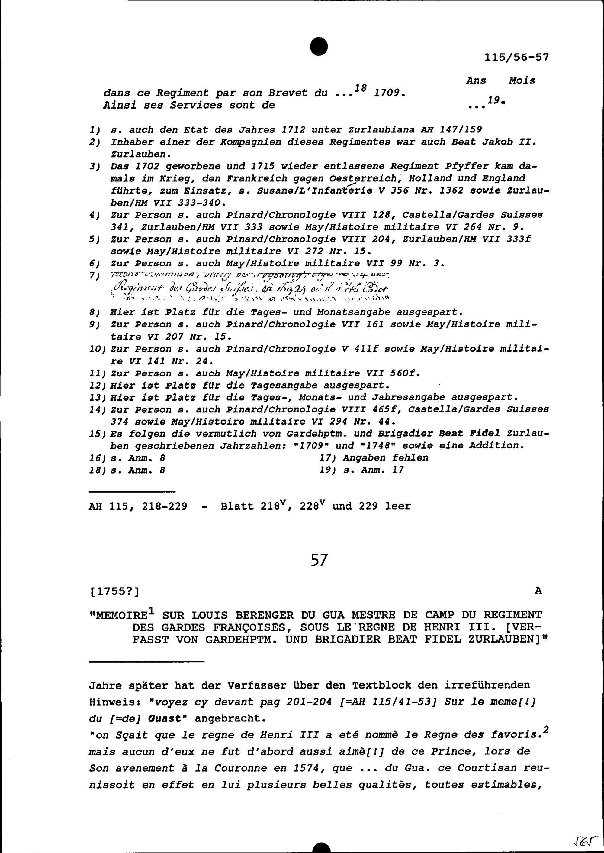Dienstleistungen der Offiziere des Schweizer Regiments Pfyffer, November 1709
