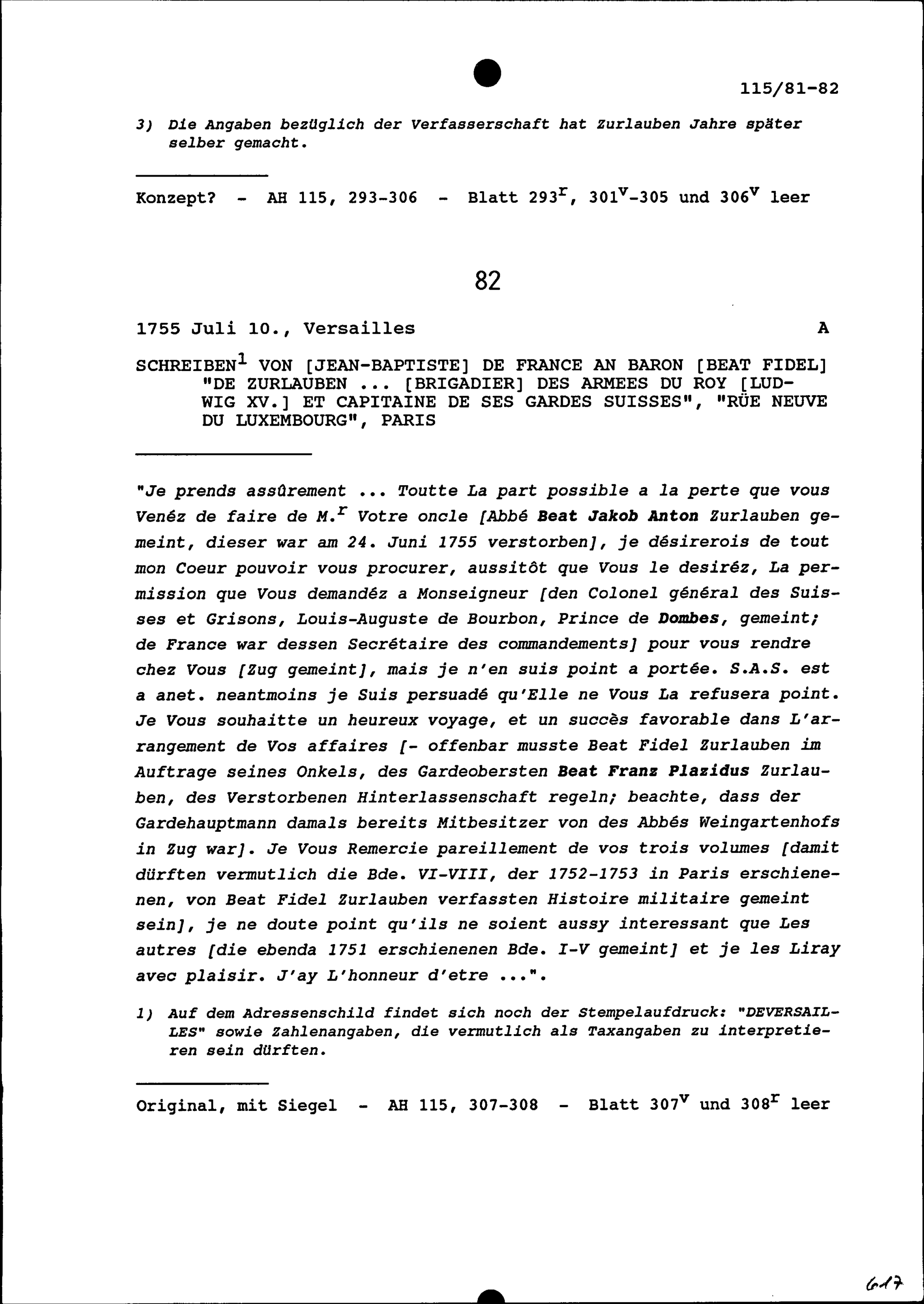 Kritische Rezension in Briefform des gedruckten Werkes von Joseph Barre: Histoire générale d'Allemagne. 3. Les Régnes depuis l'an 840. jusqu'en 1039. Paris, 1748, verfasst von Beat Fidel Zurlauben