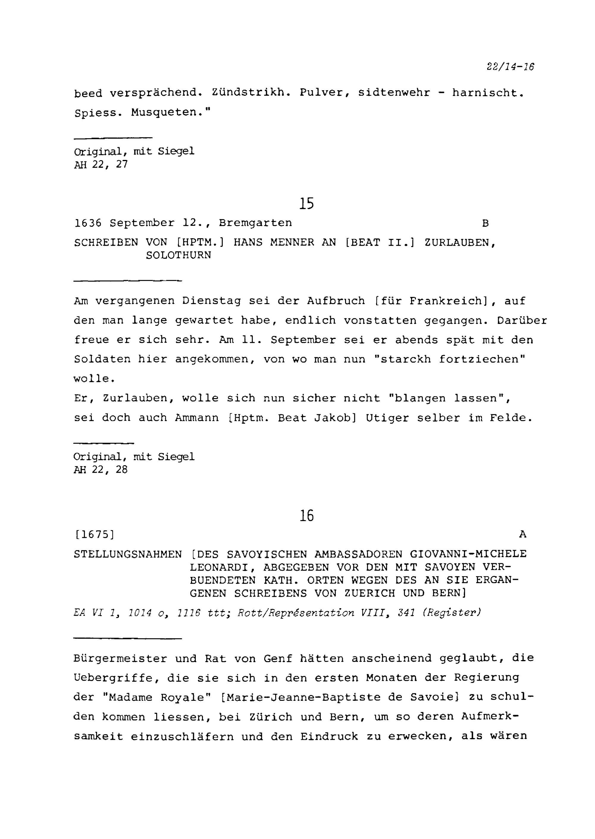 Schreiben von Hans Menner, Hauptmann, an Beat II. Zurlauben, Solothurn